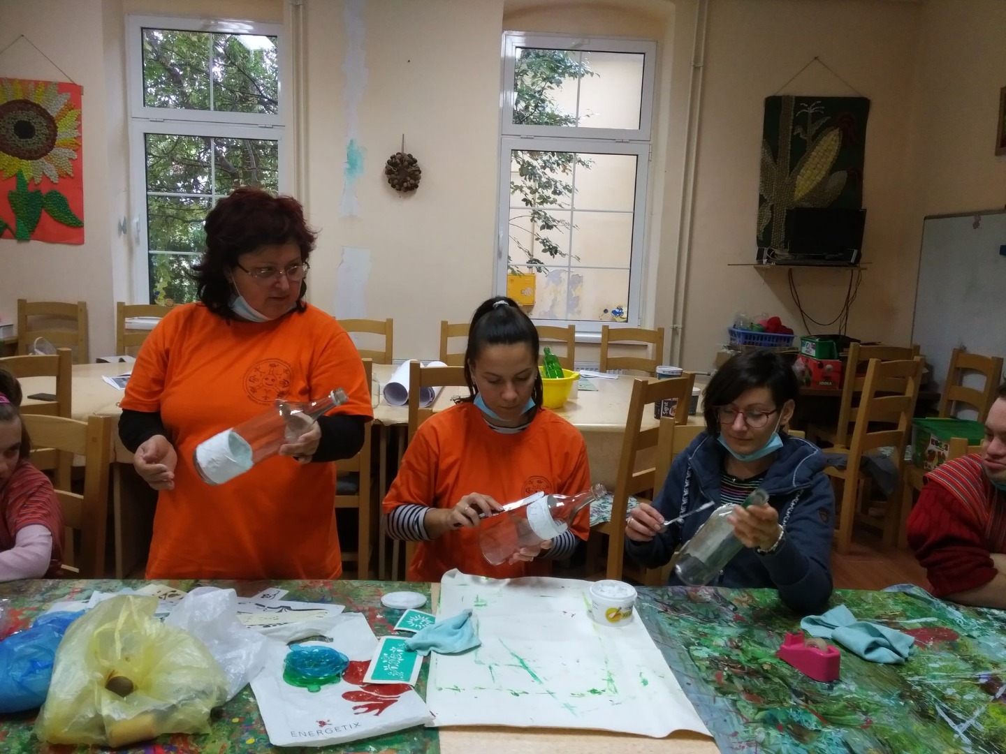 Egyesületünk közös műhelymunkán vett részt a "Kéz a Kézben" Értelmi fogyatékosok civil szervezettel. Literes üvegeket alakítottunk át csinos díszüvegekké. Befestettük őket, különböző mintákat, díszeket raktunk rájuk. Megismertettük őket az üveg festés technikájával. A csoport két részre volt osztva a vírus végett, így két napot töltöttünk mindkét csoporttal. Az alkotások csak szaporodtak, mi pedig hagytuk őket kiteljesedni.