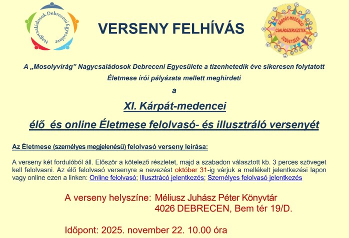 Szeretettel várunk minden korcsoporthoz tartozót, aki szívesen olvas vagy rajzol az november 22-én megrendezésre kerülő XI. Kárpát-medencei Életmese felolvasó- és illusztráló versenyünkre! Itt mindenki nyer! Nevezze tanítványát, saját gyermekét, családját, hisz ez egy kitűnő lehetőség, hogy egy nemzetközi versenyen szerepeljen és arany, ezüst, vagy bronz minősítést nyerjen! Akik nem tudnak személyesen részt venni, azok számára online formában is biztosítjuk a lehetőséget! Olvassák figyelmesen a csatolt mellékleteket! A versenyre bejelentkezés adatlapját lehetőség szerint online szeretnénk ha elküldenék, de csatoljuk a "hagyományos" formátumot is.