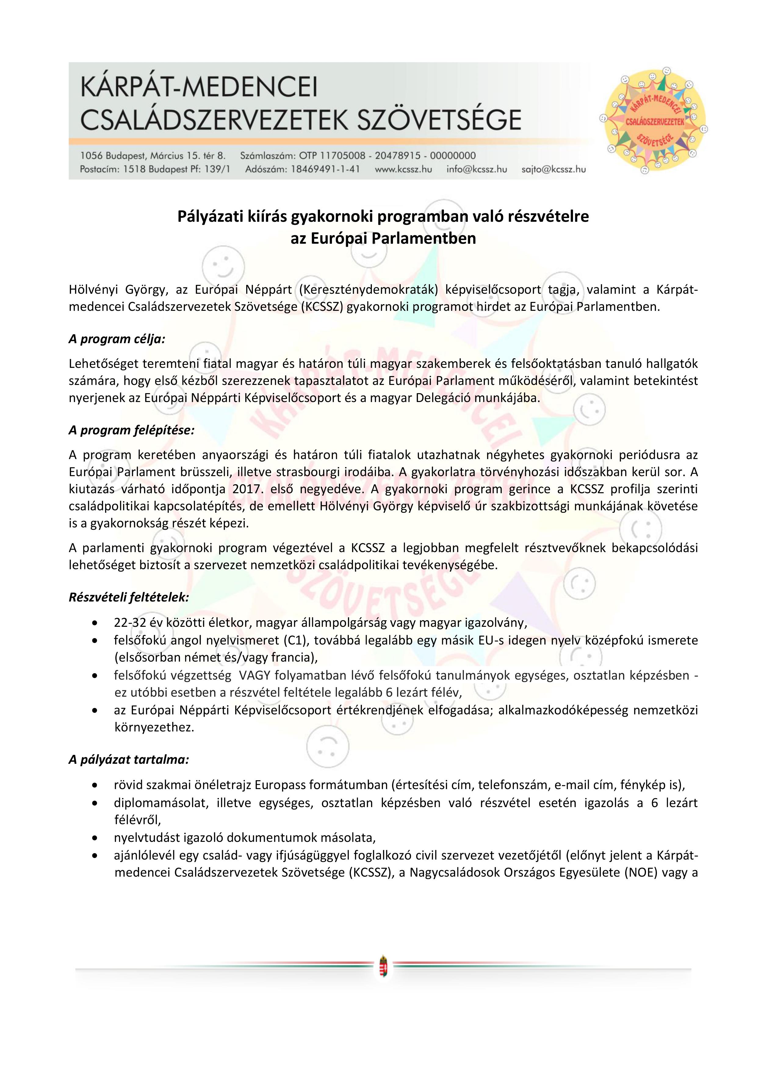 Pályázati kiírás gyakornoki programban való részvételre az Európai Parlamentben