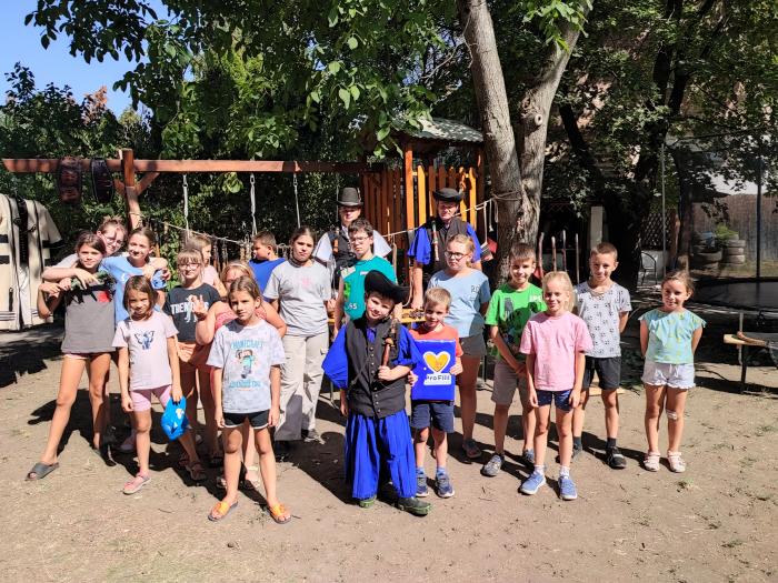 Sokrétű, színes programmal vártuk a heti 20 fős táborba jelentkező gyerekeket. A kezdő nap a város különböző pontjain, játékos feladatokkal teli kalandos városismereti séta megalapozta a hangulatot. De a két hét folyamán sok érdekességben volt részük. Rendőrségi közlekedési vetélkedő Kis Rózsa rendőr századossal, templom látogatás, bátrabbaknak a toronyba fellépkedés, de volt relaxáció, gyermekjóga, kézműves foglalkozás. Az egészségnapon közös tízórai készítés, gyümölcsnyársak is készültek. Messzire kirándultunk, Soltvadkertre a Vad-Kert gazdaságba. A gyerekek etethettek szarvasokat, simogathattak bájos kicsi kecskéket, láthattak sokféle háziállatot. Még a kecske fejéssel is megpróbálkozhattak! Házigazdánk egzotikus állatokat is hozott barátkozni- óriás tücsköt, kígyót, teknőst, agámát. A forró napot a híres Korona cukrászda fagyijával fejeztük be.