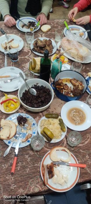 Miután az ebéd elkészült közösen megebédeltünk. Disznó paprikást savanyú káposztával és házi kenyérrel,, desszertként hájas kiflit fogyasztottunk. Ebéd közben gyerekkori mesék kerültek elő egyik a másik után. Élvezettel hallgattuk egymás gyerekkori csínytevéseit.