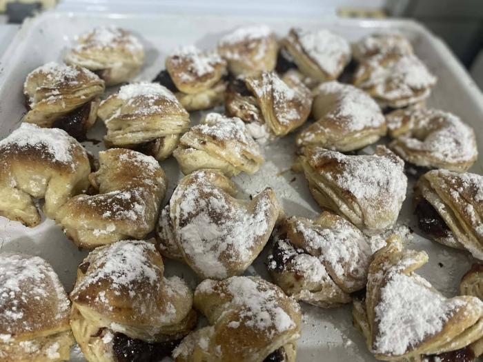 Addig a nők benn a kiskonyhában reggelit készítettek és a hájas kifli elkészítési módját tanulták és kelesztettek a vendégék részére.